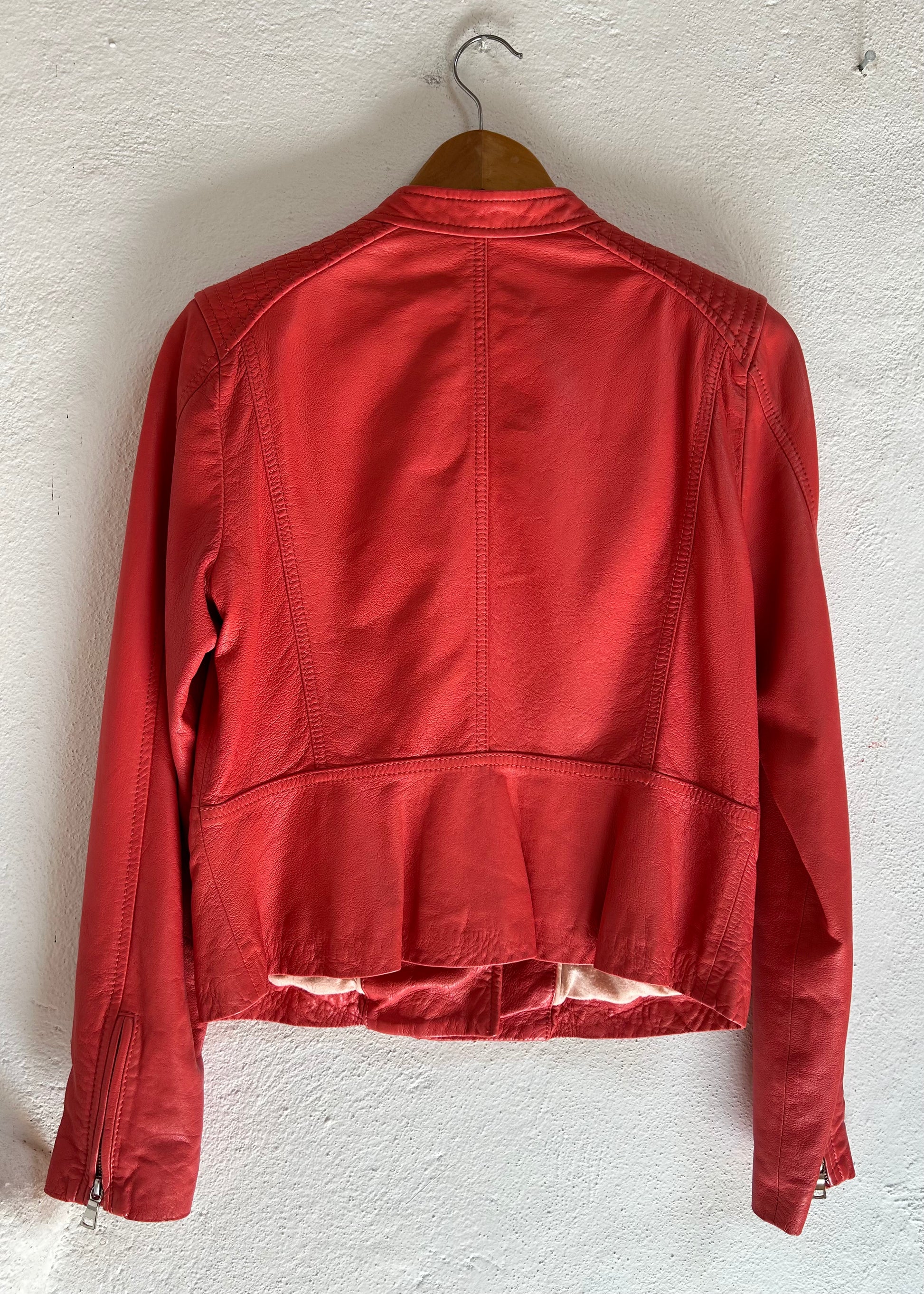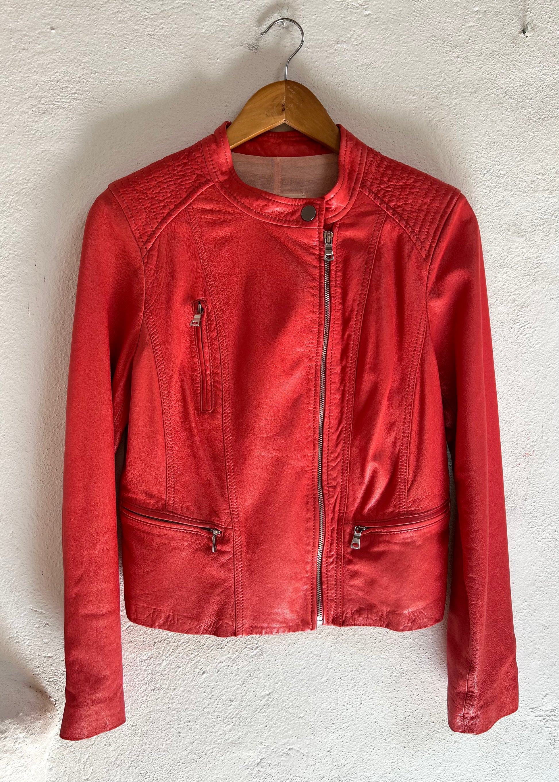 Chaqueta con cuello redondo y cierre frontal, hombros semi acolchados, sutiles y cierres en los puños. El color es maravilloso, da mucha alegría y poder a tus outfits.