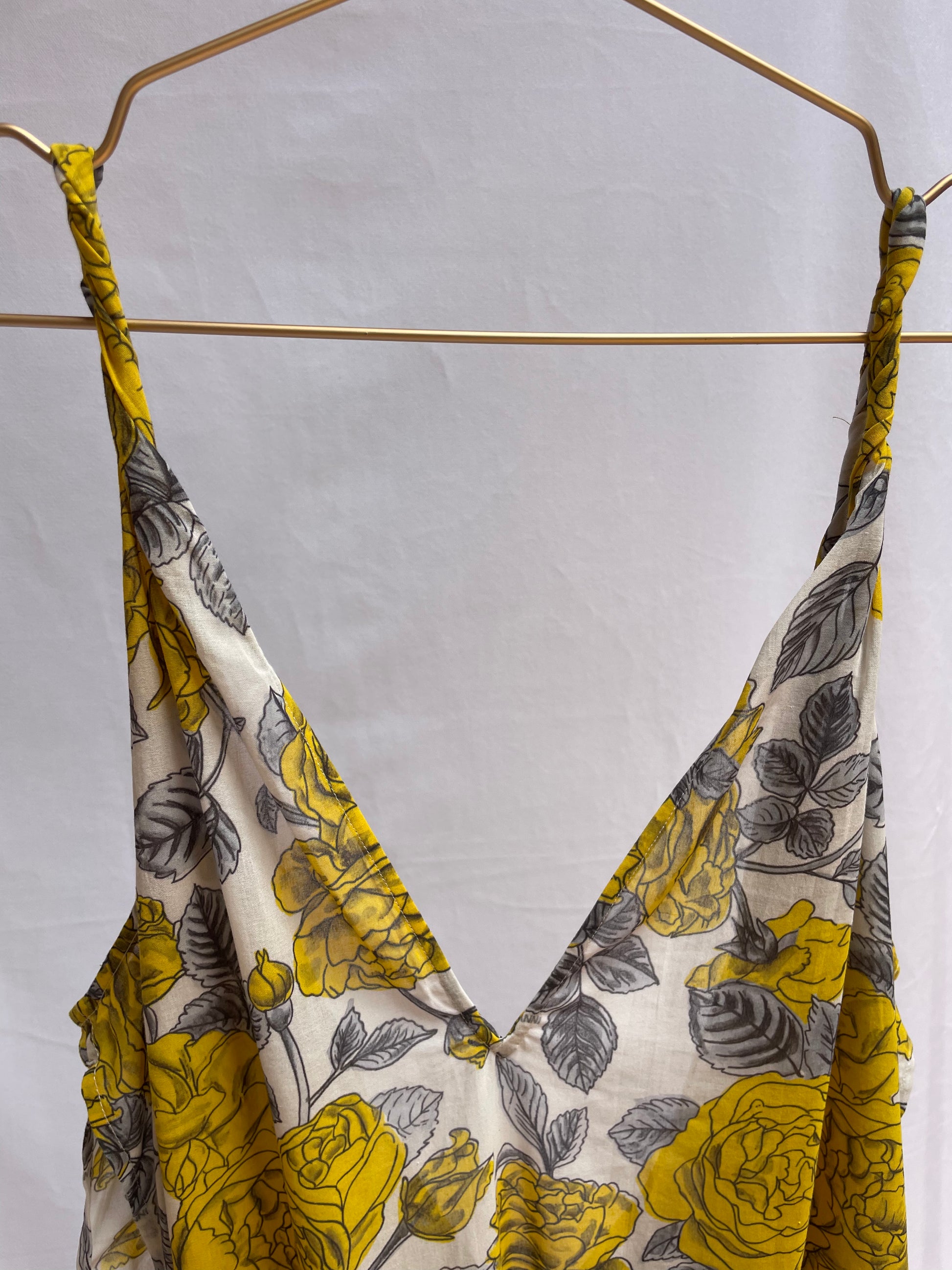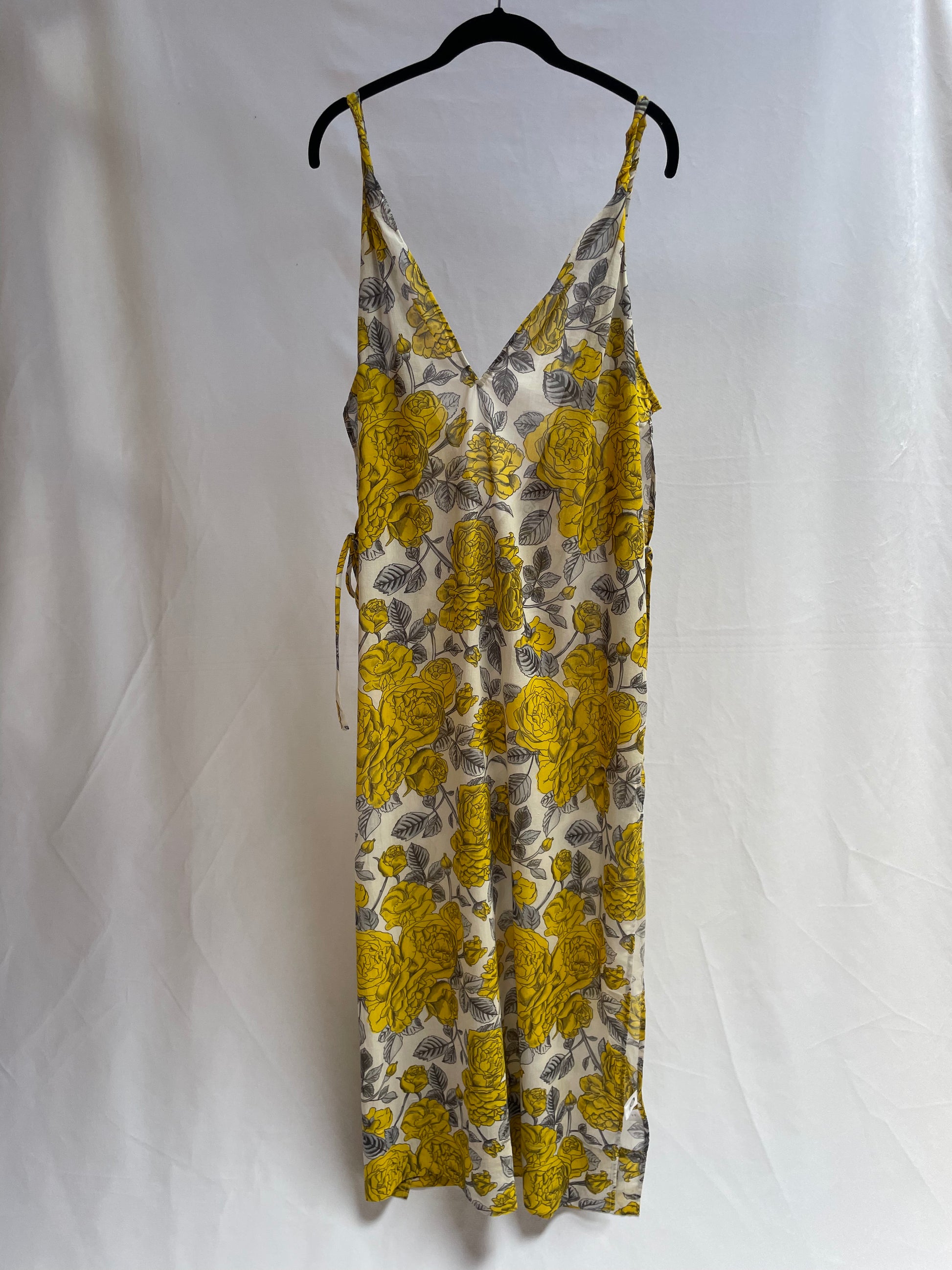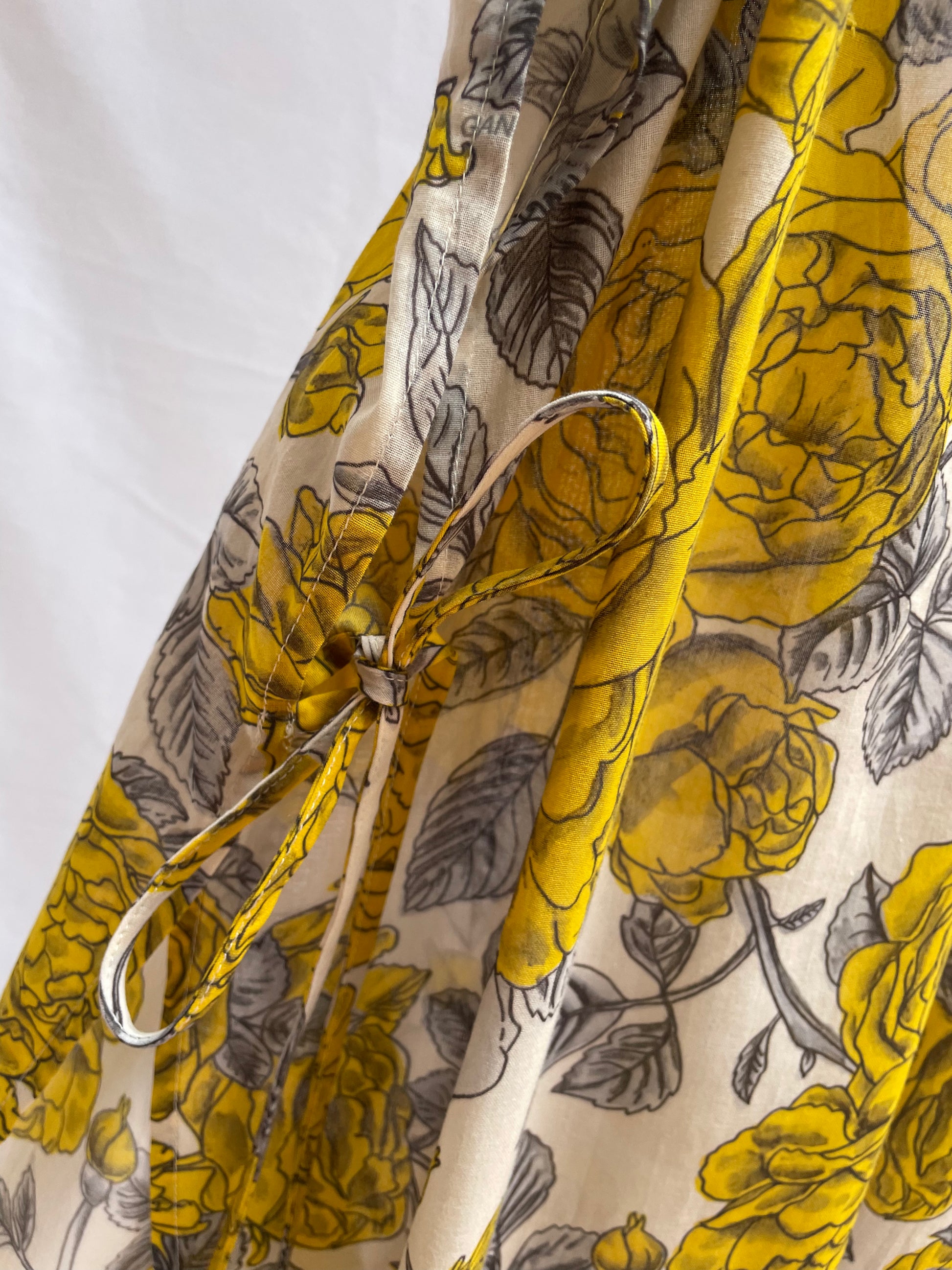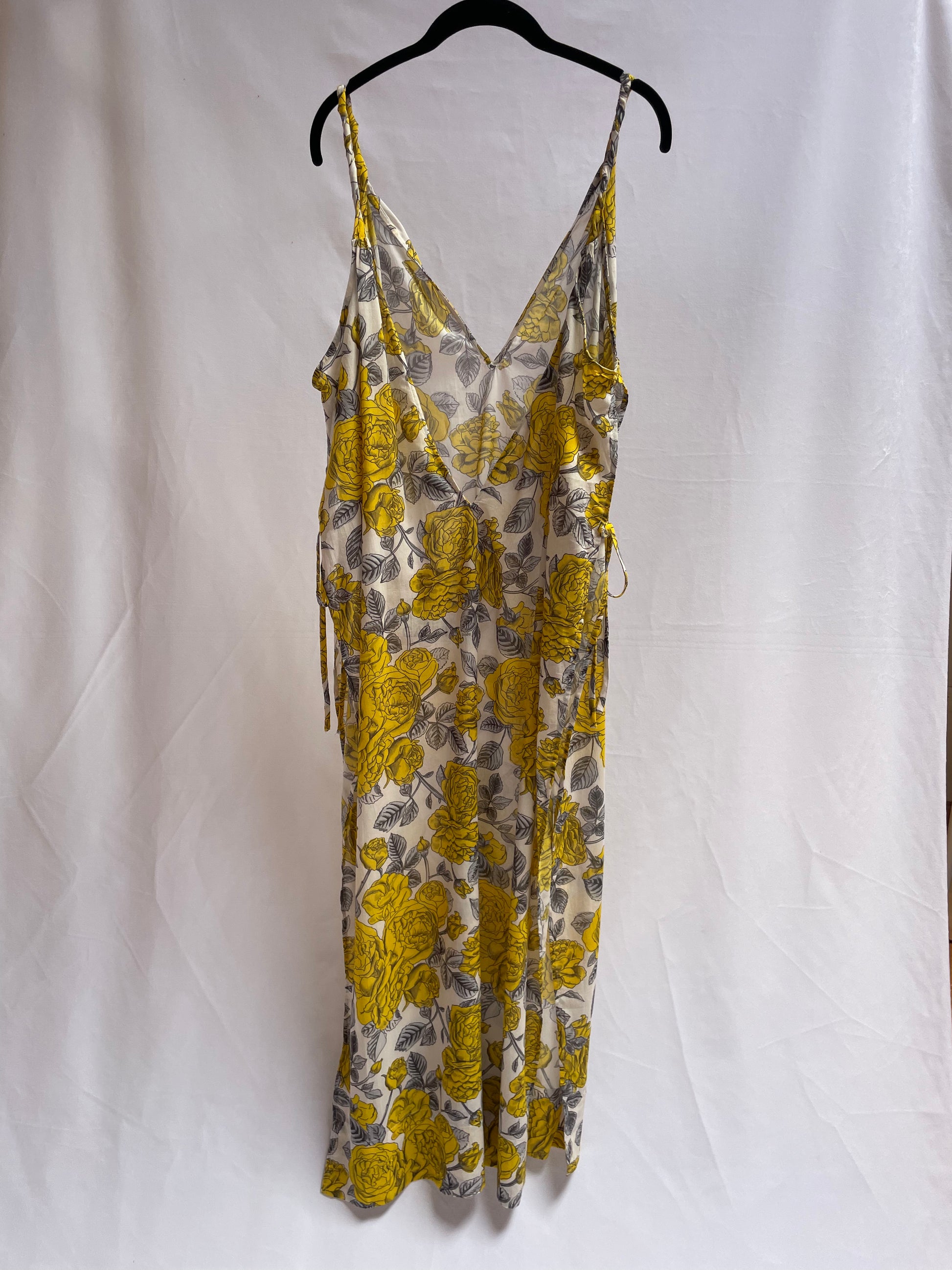 Un vestido tipo pareo, maxi hasta el piso, ideal para usar con traje de baño pero también con top y pantalón para un look tropical en la ciudad. Tiene un print de flores amarillas grandes con combinación en blanco y gris, y detalle de tiras para amarrar a los lados, muy ligero.