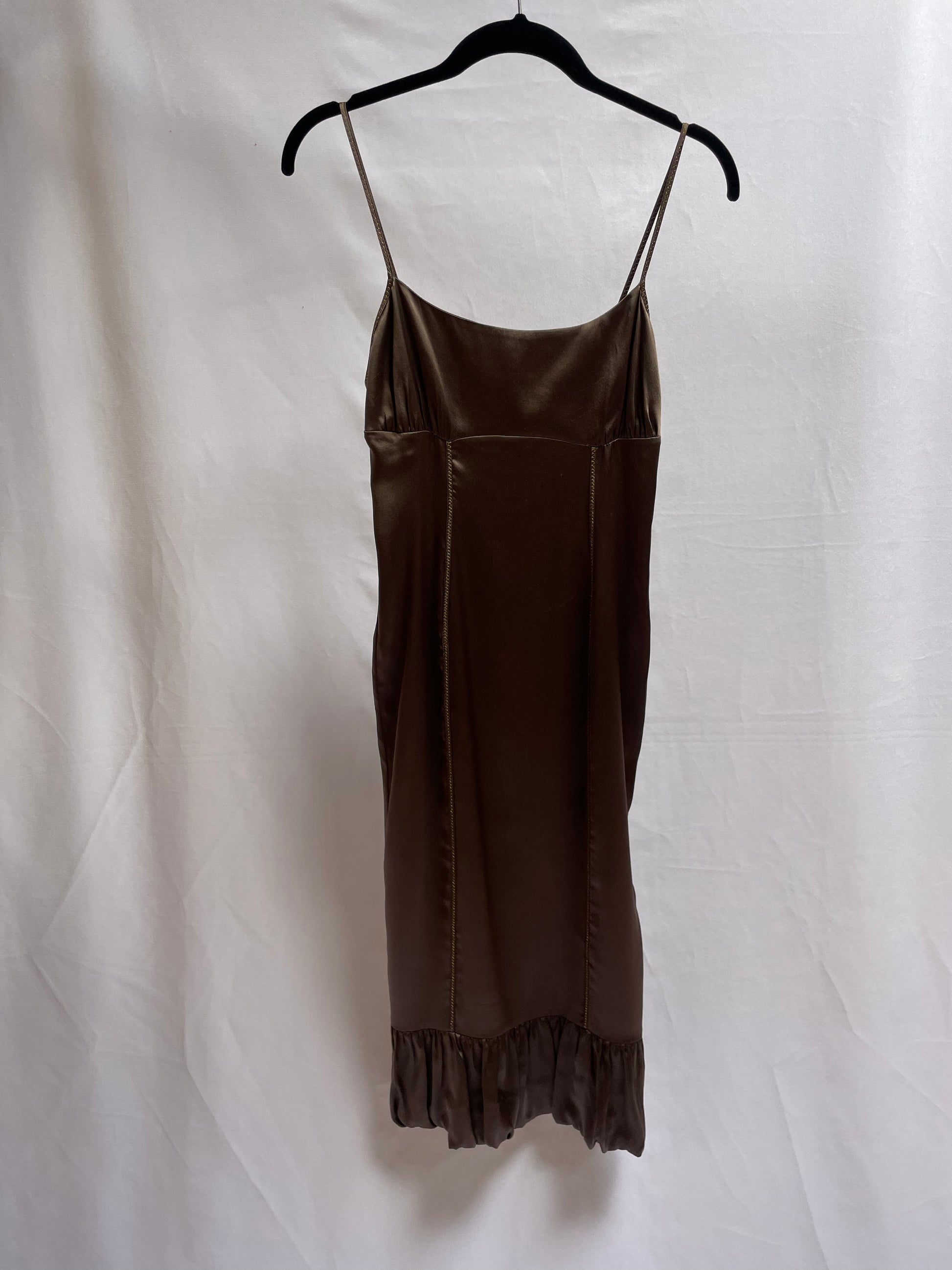 Vestido midi, de tiras ultrafinas y detalle de costura en dorado. El escote es hasta la espalda media, el color y material satinado lo hace elegante, ideal para cualquier evento semi-formal o coctel, detalle bombacho al final, muy sofisticado.